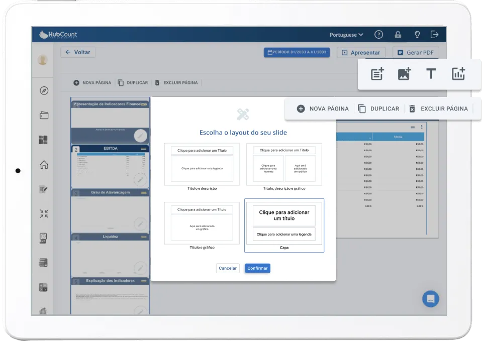 Após finalizar todas as edições, você poderá realizar a apresentação dentro da Hub ou, se preferir, também pode exportar do arquivo em PDF.