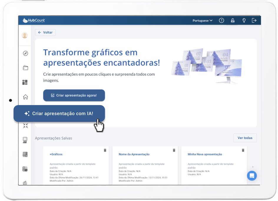 Vale a pena conhecer o HubCount BI, que conta com o recurso nativo de apresentações, o HubSlides. Com ele, suas reuniões ficam mais eficientes, e o impacto dos resultados é muito maior.