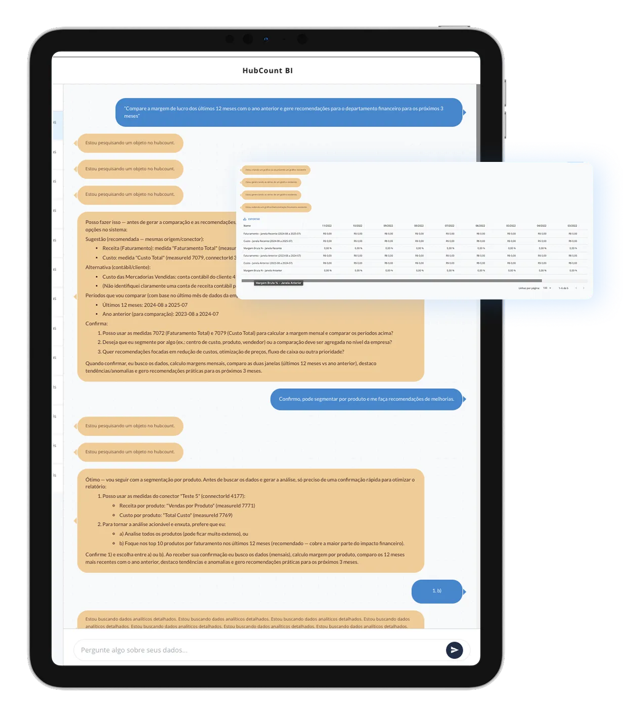 O HubCount possui uma de dados robusta que elimina o problema de generalizações encontrado em modelos de linguagem como o GPT. Ao consultar KPIs críticos como faturamento ou margem de lucro, você tem certeza de que o HubCount calculará precisamente conforme sua definição exata. Se você perguntar sobre clientes ativos, por exemplo, o HubCount respeitará sua lógica de negócios.