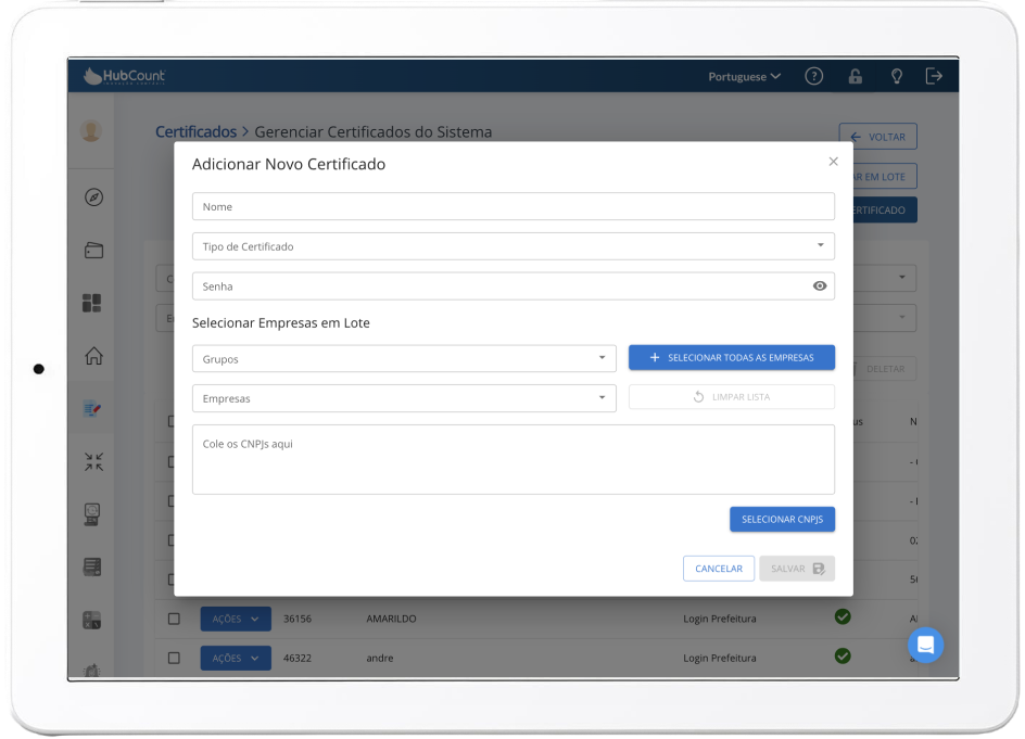 O primeiro passo é clicar em "Cadastros" e depois clicar em "Certificados/Logins".