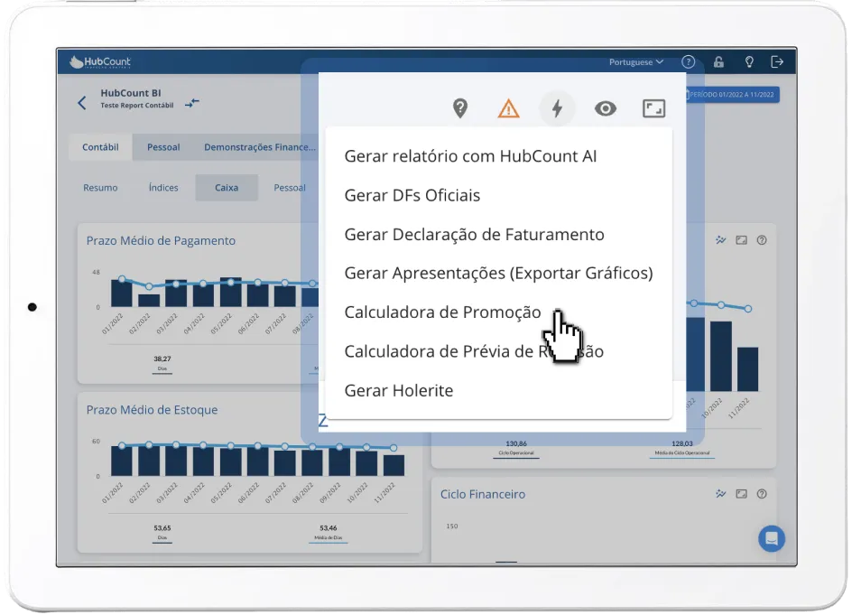 Acesse o HubCount BI, clique no ícone de raio e selecione a opção "Calculadora de Promoção".