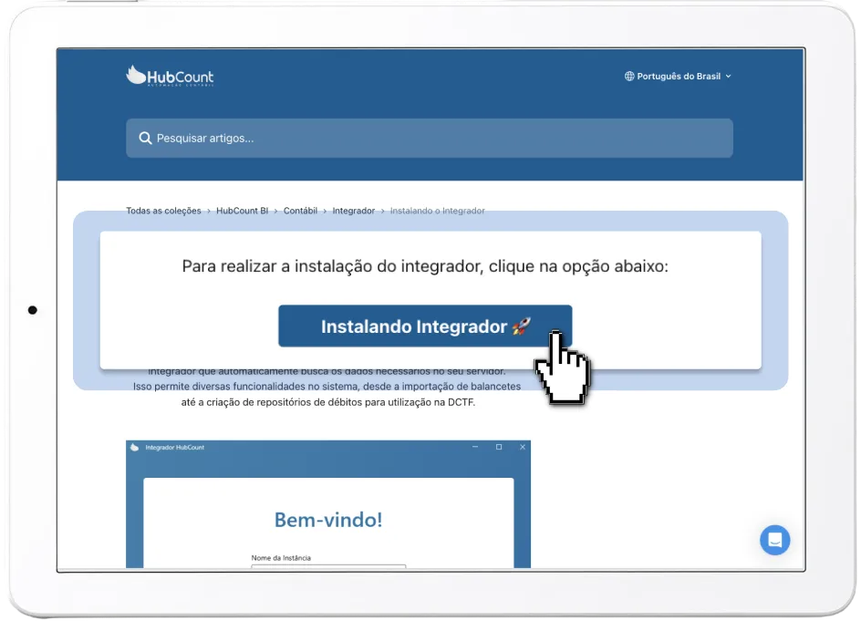 Para começar, dentro da página da central de ajuda da HubCount, clique no botão “Instalando o integrador”.