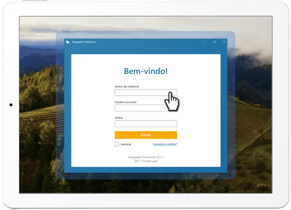 Após a instalação será necessário acessar o aplicativo salvo em sua área de trabalho com os dados de acesso ao HubCount BI, como instância, login e senha.