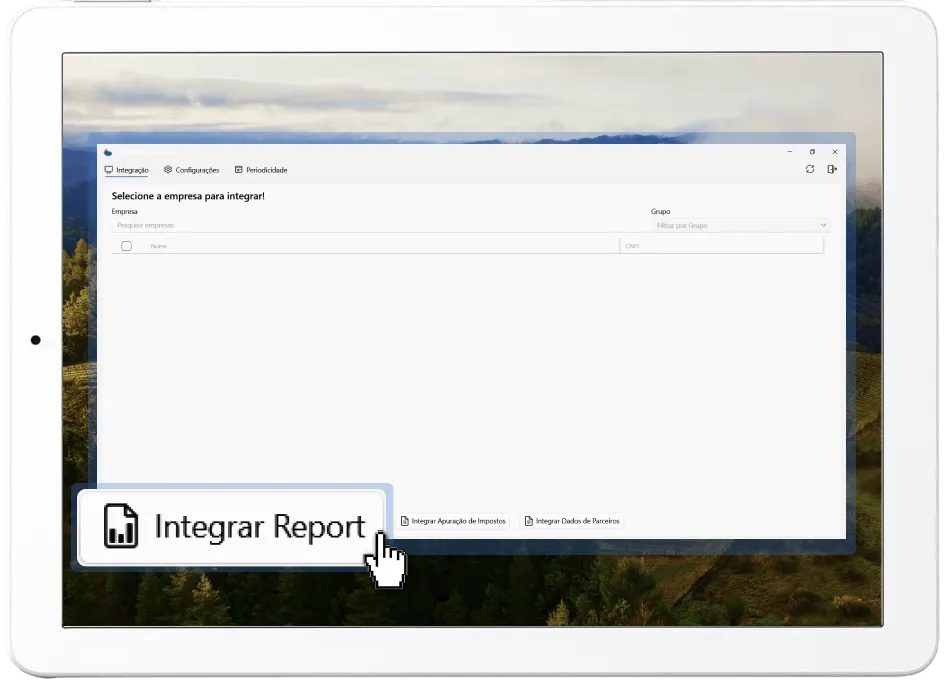 Agora que já configurou o integrador corretamente, você pode automatizar ainda mais a importação dos balancetes. Para isso, selecione a empresa na lista, depois clique em "Integrar Report".