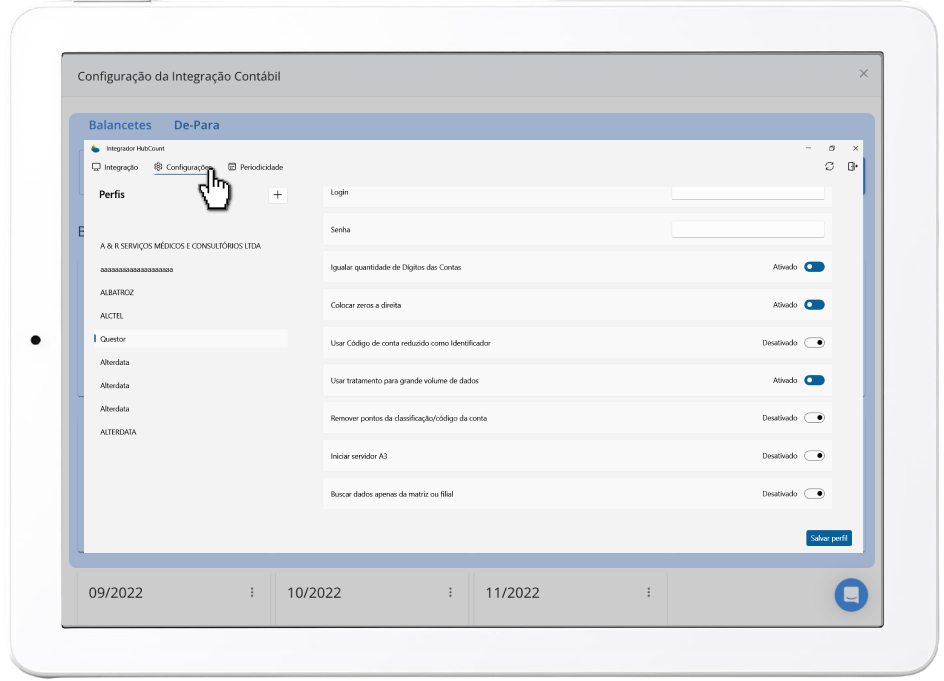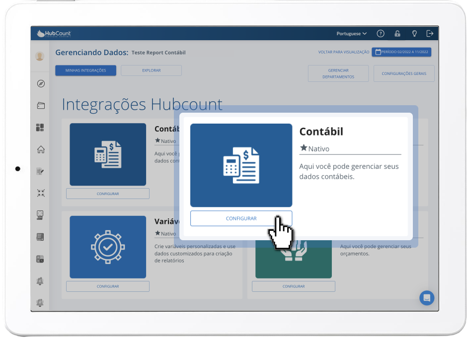 Assim que acessar a tela de gerenciamento de dados encontre a opção "contábil", clique em “Configurar”.