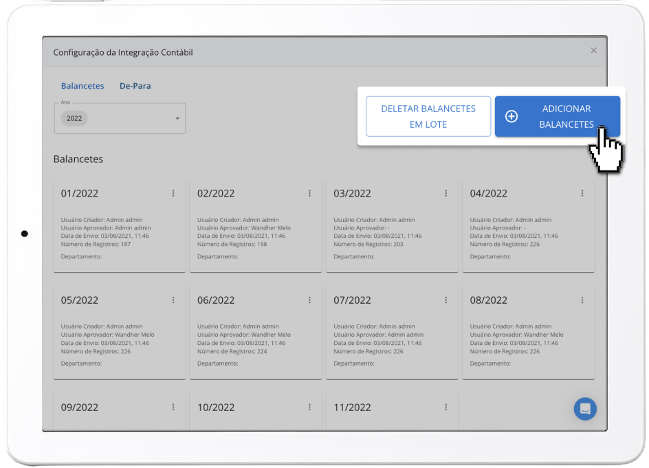Ao entrar na página de configuração, localize e clique na opção de "Adicionar Balancetes", no lado direito.
