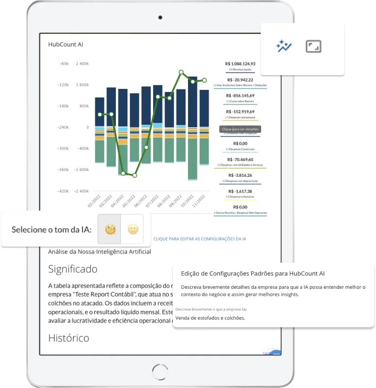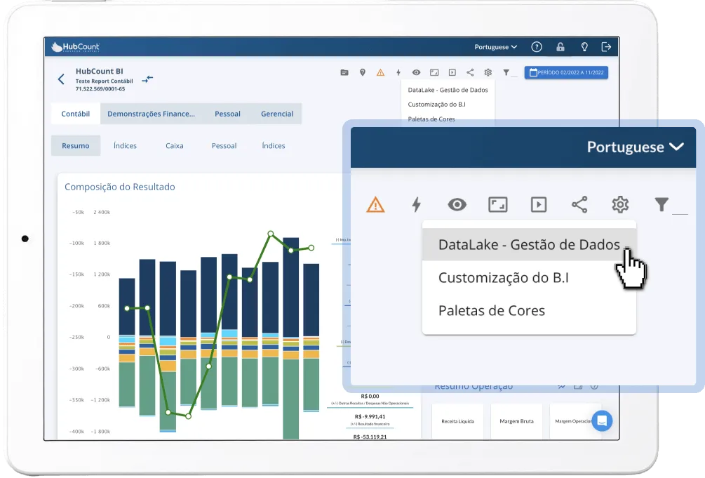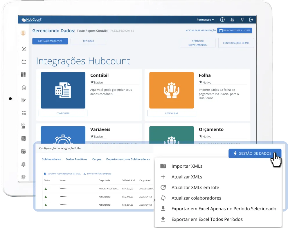 Dados já integrados: Contábil, eSocial, folha, fiscal, tributário. HubCount BI entrega: