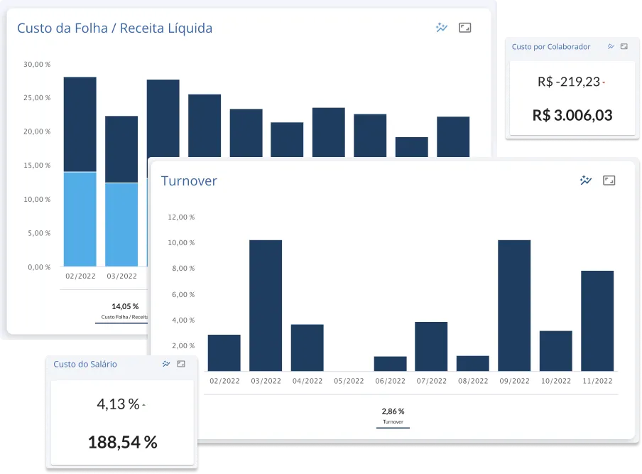 DP Estratégico: Gere métricas do Departamento Pessoal como custo por colaborador, turnover e impacto dos benefícios e tributação sobre a folha de pagamento.