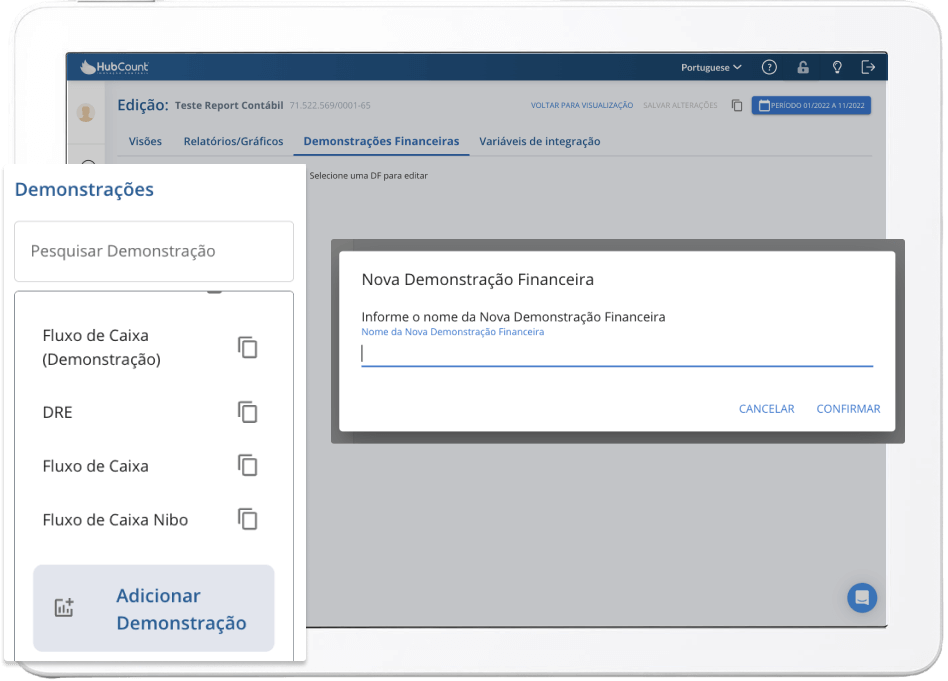 Selecione a aba "Demonstrações Financeiras" e clique em “Adicionar Demonstração”. Defina um nome para essa nova criação.
