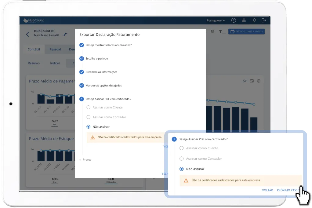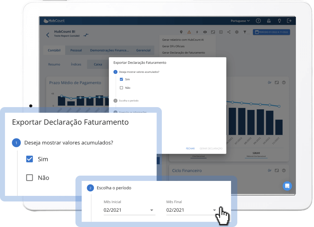 Dados integrados: Os dados da declaração são extraídos de informações integradas ao HubCount BI, atualizadas em tempo real, garantindo precisão e confiabilidade.