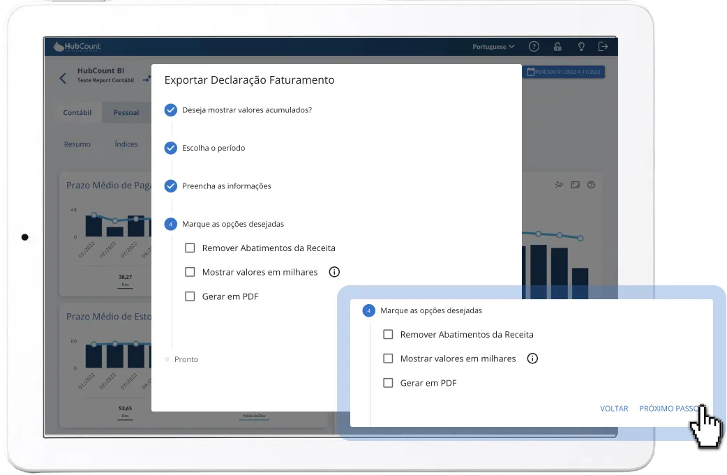 Otimização dos esforços: A exportação direto pelo HubCount BI elimina a necessidade de preenchimentos manuais, economizando tempo e reduzindo erros.